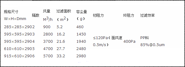 組合式中效過濾器規格尺寸及標準技術參數: