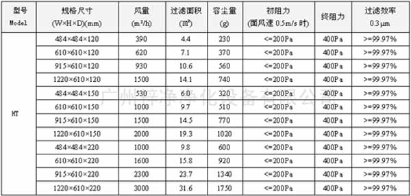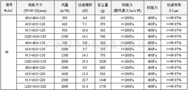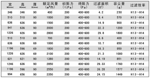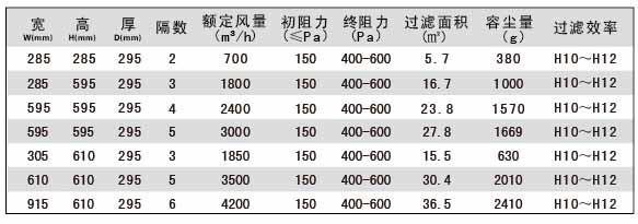 有隔板高效過濾器規格尺寸及風量容塵量技術參數: