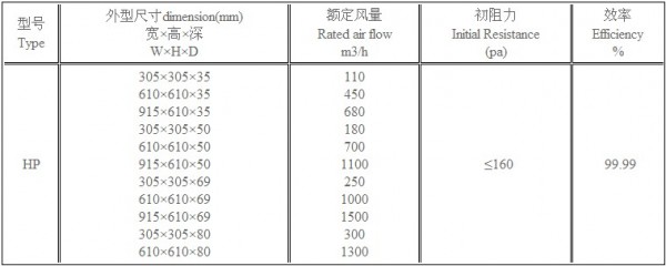 HP超薄式無(wú)隔板高效過(guò)濾器型號(hào)尺寸及其它參數(shù):